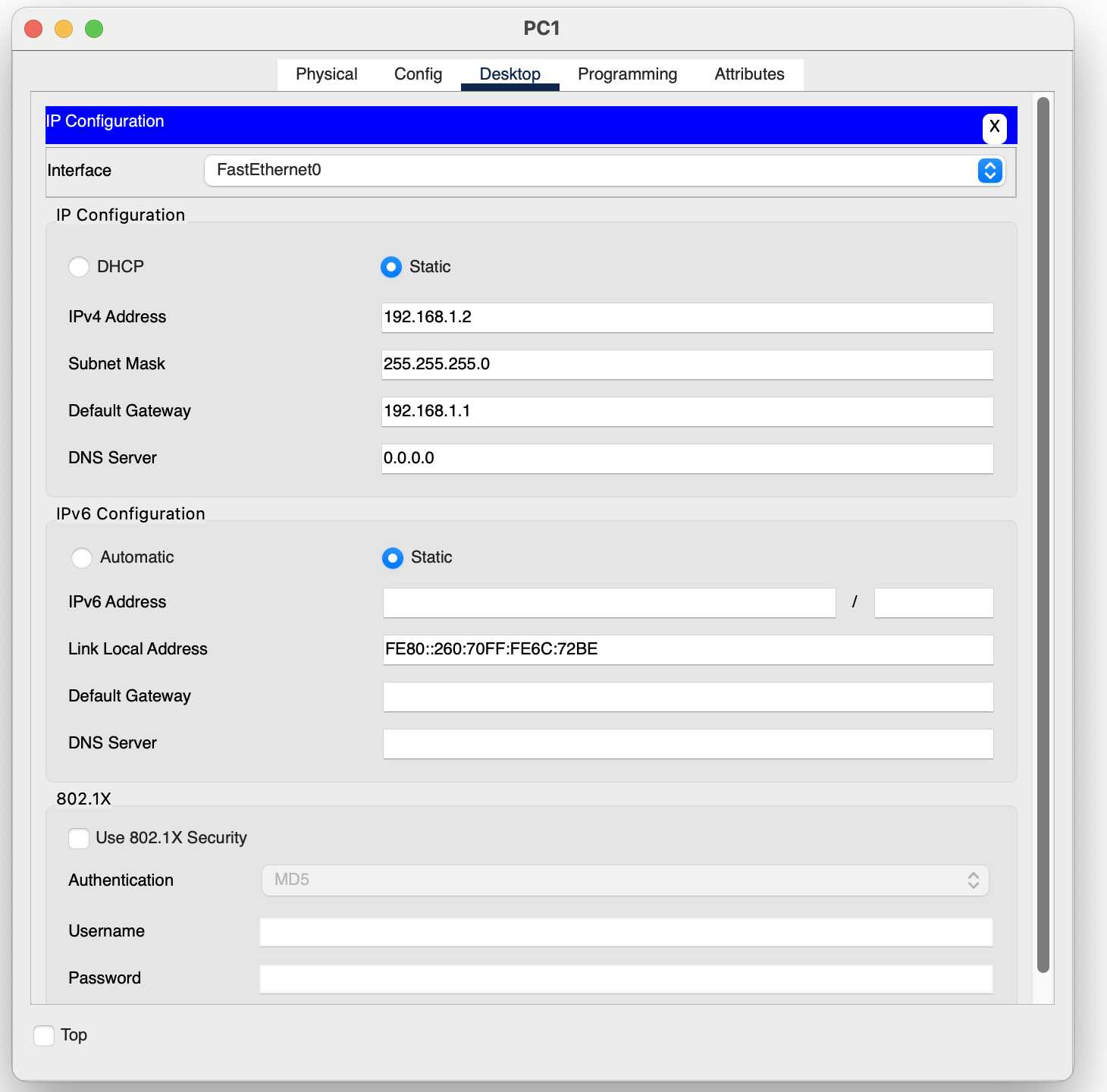 PC을 클릭한 다음 Desktop 메뉴를 누르고, 첫 번째 메뉴인 IP Configuration으로 들어간다.