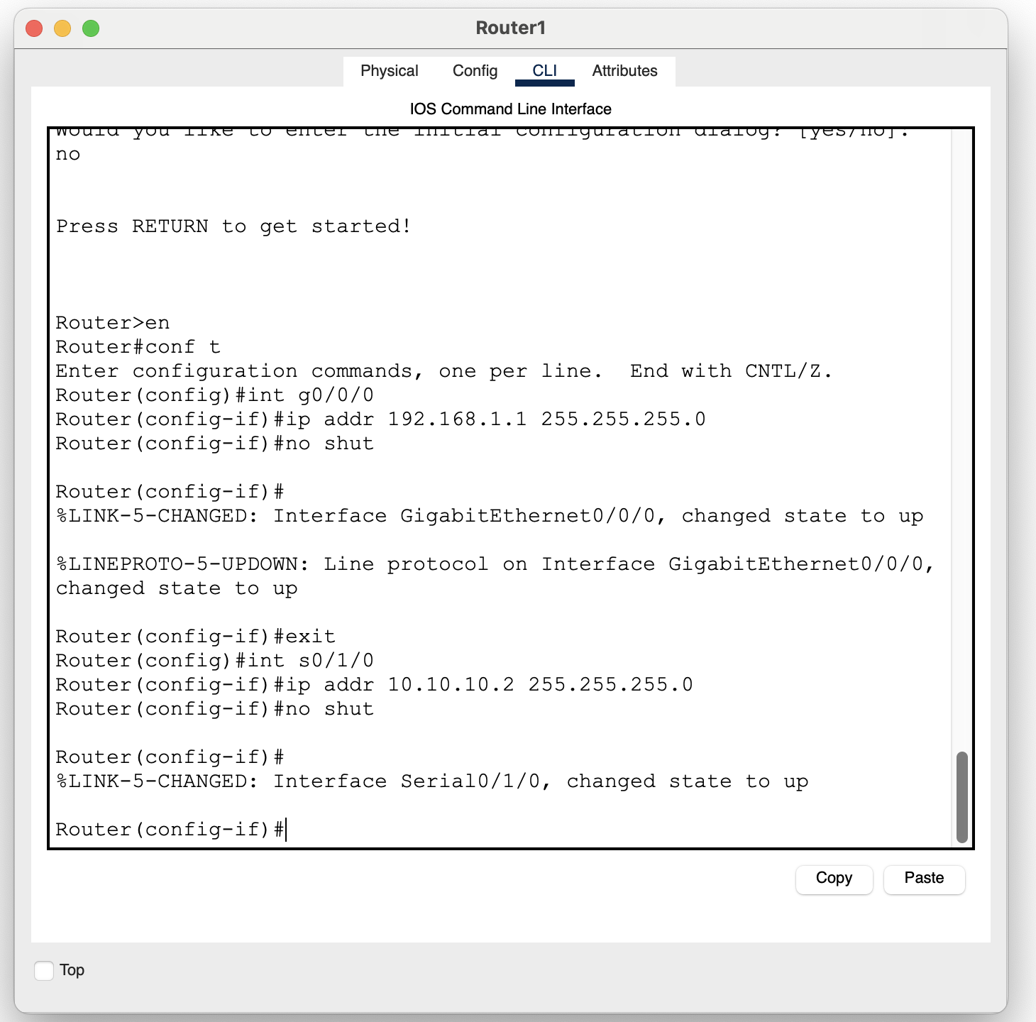 다시 왼쪽 라우터를 클릭한 다음 다음 명령어로 라우터와 라우터 사이 포트, 라우터와 PC사이의 포트를 활성화 시킨다.